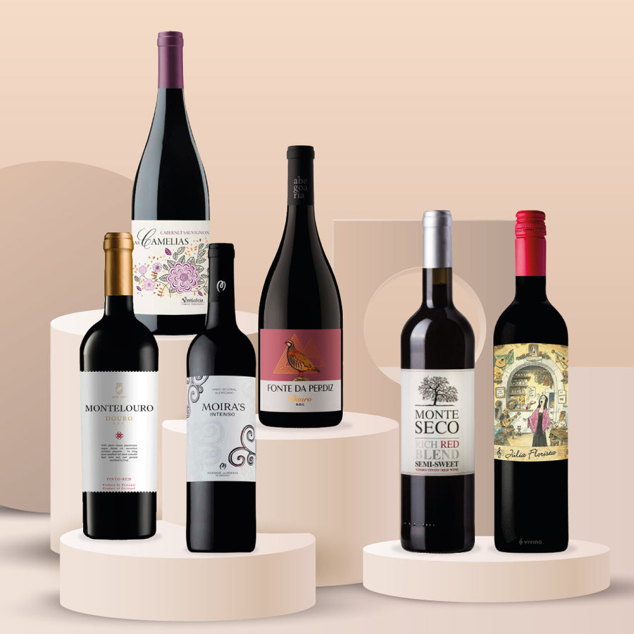 2x Camelias Cabernet Sauvignon 75cl, 2x Montelouro Red 75cl, 2x Julia Florista Red 75cl, 2x Monte Seco Red 75cl, 2x Fonte da Perdiz Red 75cl, 2x Moiras Bodied Red 75cl.