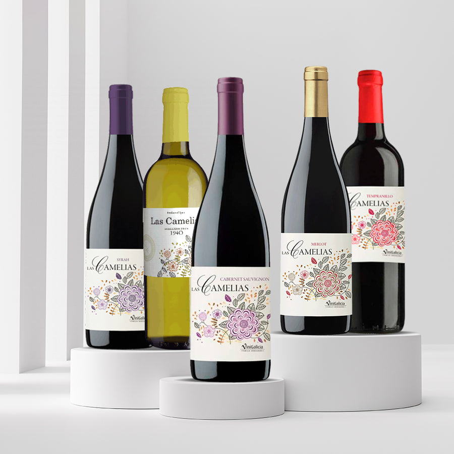 3x Camelias Cabernet Sauvignon 75cl, 3x Camelias Merlot 75cl, 2x Camelias Tempranillo 75cl, 2x Camelias Syrah 75cl, 2x Camelias Verdejo 75cl.