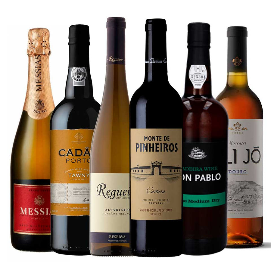 1x Monte Pinheiro Red 75cl, 1x Don Pablo Madeira 75cl, 1x Quinta do Regueiro Alvarinho Reserva 75cl, 1x Cadão Port Tawny 75cl, 1x Alijo Moscat 75cl and 1x Messias Gran Cuveé Millesime Brut.